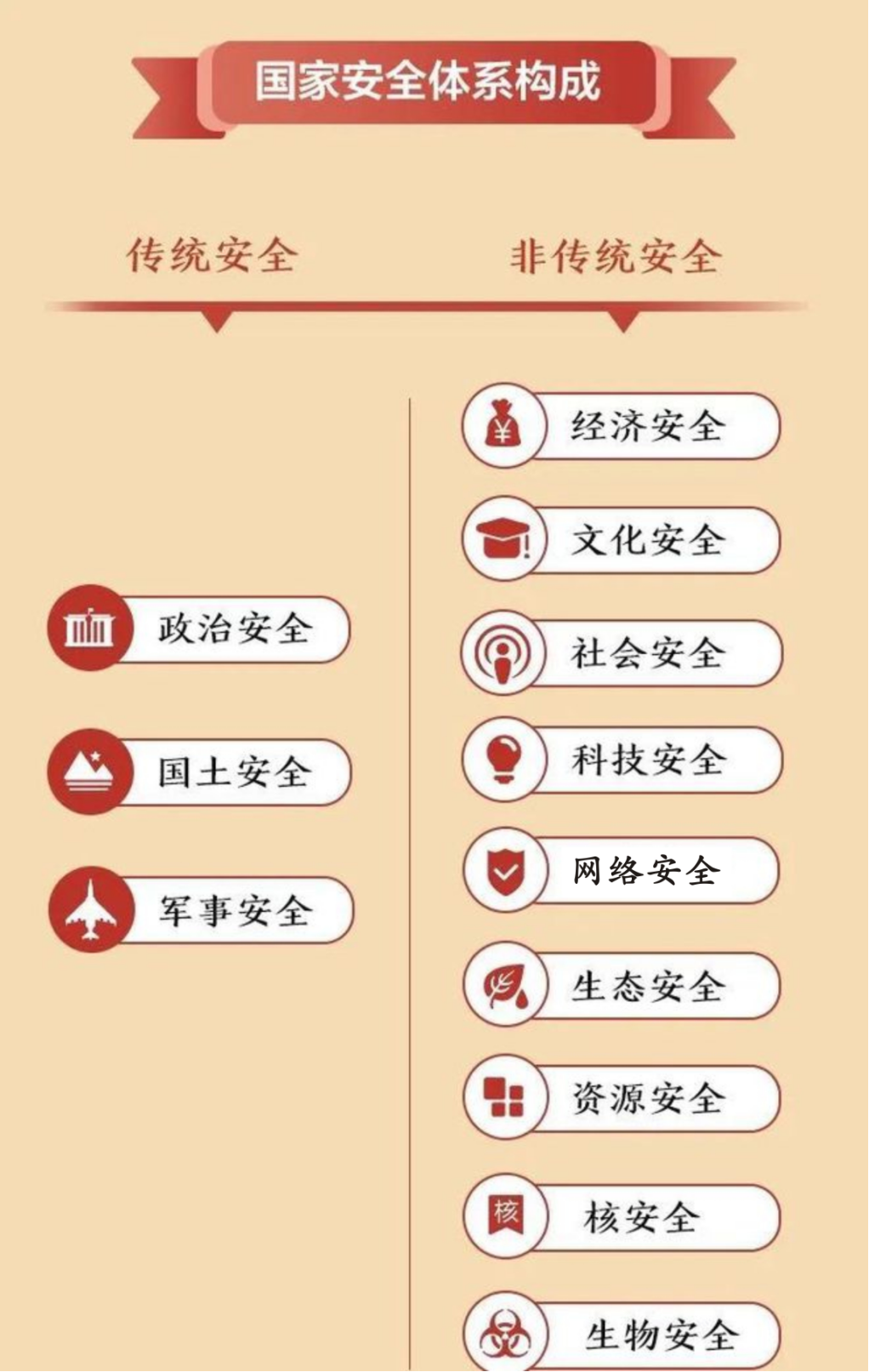 國家安全涉及的16個(gè)重點(diǎn)領(lǐng)域包括:政治安全、國土安全、軍事安全、經(jīng)濟(jì)安全、文化安全、社會安全、科技安全、網(wǎng)絡(luò)安全、生態(tài)安全、資源安全、核安全、海外利益安全、生物安全、太空安全、深海安全、極地安全等。
