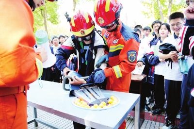 疏散演練結(jié)束后,消防宣傳員為6000余名師生帶來消防知識(shí)宣講課,就火災(zāi)發(fā)生后如何正確逃生自救等進(jìn)行重點(diǎn)講解。在校園內(nèi),消防部門展出了各種救援車輛和裝備,并設(shè)置液壓擴(kuò)張鉗夾取乒乓球、消防作戰(zhàn)服穿戴、消防水槍水帶快速連接鋪設(shè)等互動(dòng)體驗(yàn)項(xiàng)目,吸引不少學(xué)生積極參與體驗(yàn)(如圖)。“液壓擴(kuò)張鉗太重了,我用了很大力氣才夾起乒乓球,消防員叔叔利用這種技術(shù)開展救援真的很不容易。”參加體驗(yàn)的高一學(xué)生張恒說。