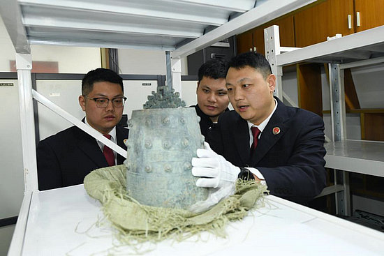 圖為檢察機關(guān)辦案人員查看被盜的青銅編鐘。(淮安市檢察院供圖)