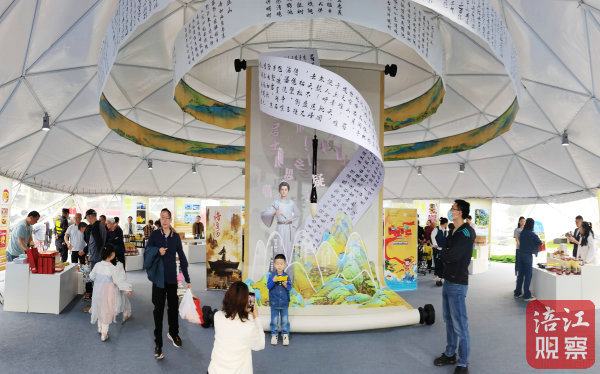 走進(jìn)此次活動(dòng)主題縣江油館,映入眼簾的是太白立體畫軸創(chuàng)意造型,畫軸以李白詩(shī)詞為屏,畫軸前方為立體的奇山異水造型,向杭州市民展示“蜀道太白鄉(xiāng),詩(shī)意棲居地”的浪漫江油。不少前來(lái)觀展的杭州市民,忍不住拿起手機(jī)與“李白”合影。