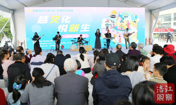 在展演區(qū),杭州市西湖區(qū)文新街道辦事處舉辦的廣場(chǎng)音樂(lè)會(huì)正在進(jìn)行中。來(lái)自杭州聲之韻青年藝術(shù)團(tuán)、高校校友之家的演員們,為現(xiàn)場(chǎng)觀眾帶來(lái)了一場(chǎng)“青春風(fēng)暴”。