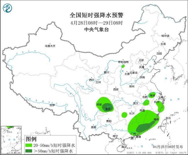 預(yù)計,4月28日08時至29日08時,內(nèi)蒙古中部、陜西北部、山西北部、四川盆地中東部、重慶西部、廣東東部、福建南部等地部分地區(qū)有大到暴雨,其中,廣東東部、福建東南部等地局地有大暴雨(100~180毫米)。上述部分地區(qū)伴有短時強(qiáng)降水(最大小時降雨量30~50毫米,局地可超過60毫米),局地有雷暴大風(fēng)等強(qiáng)對流天氣。