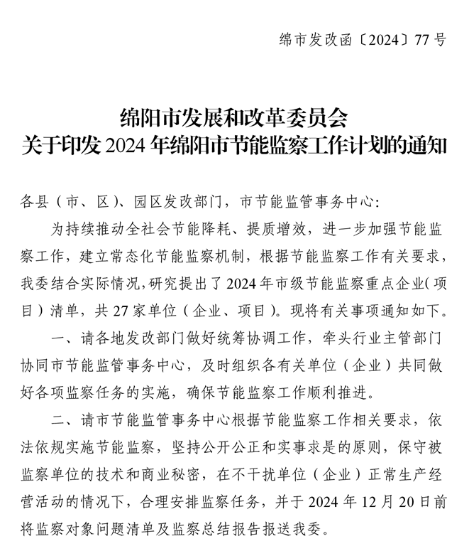 綿陽市發(fā)展和改革委員會關(guān)于印發(fā)2024年綿陽市節(jié)能監(jiān)察工作計(jì)劃的通知