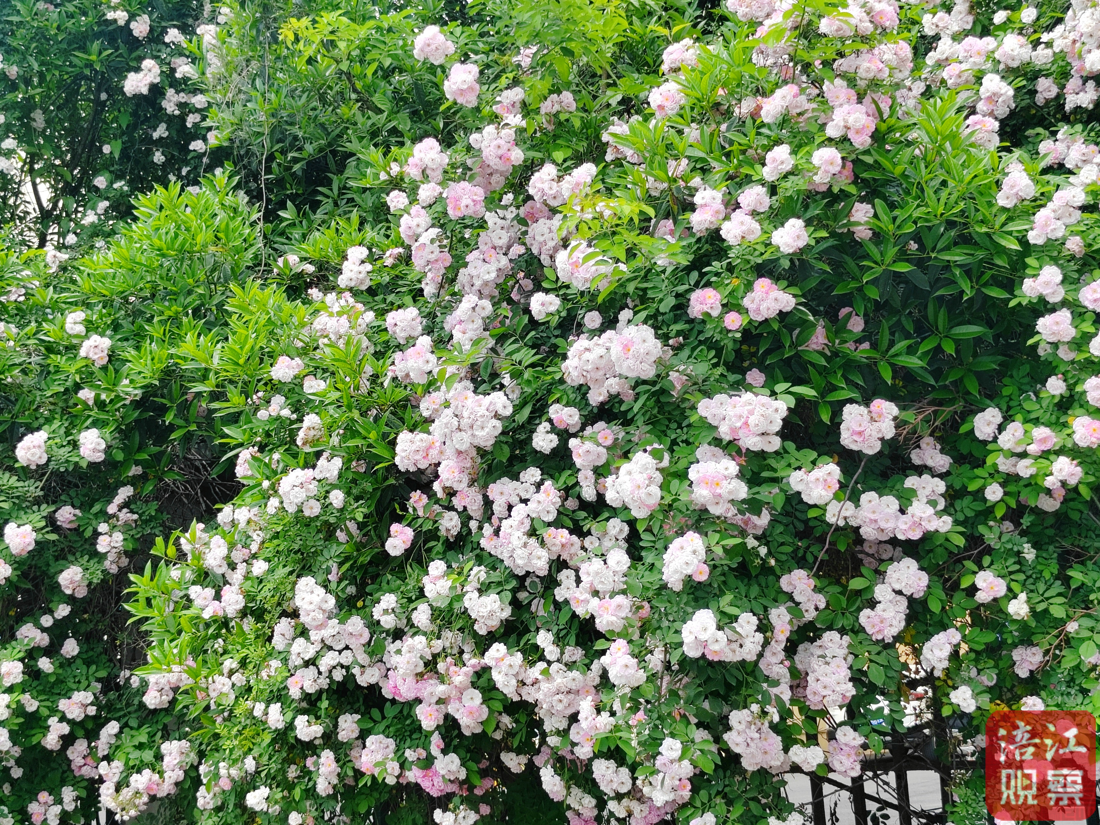 在江油青蓮鎮(zhèn)武家坡綿江公路旁,同為薔薇屬的“七里香”形成了一溜長(zhǎng)長(zhǎng)的花墻,皎潔的花朵隨風(fēng)搖曳。