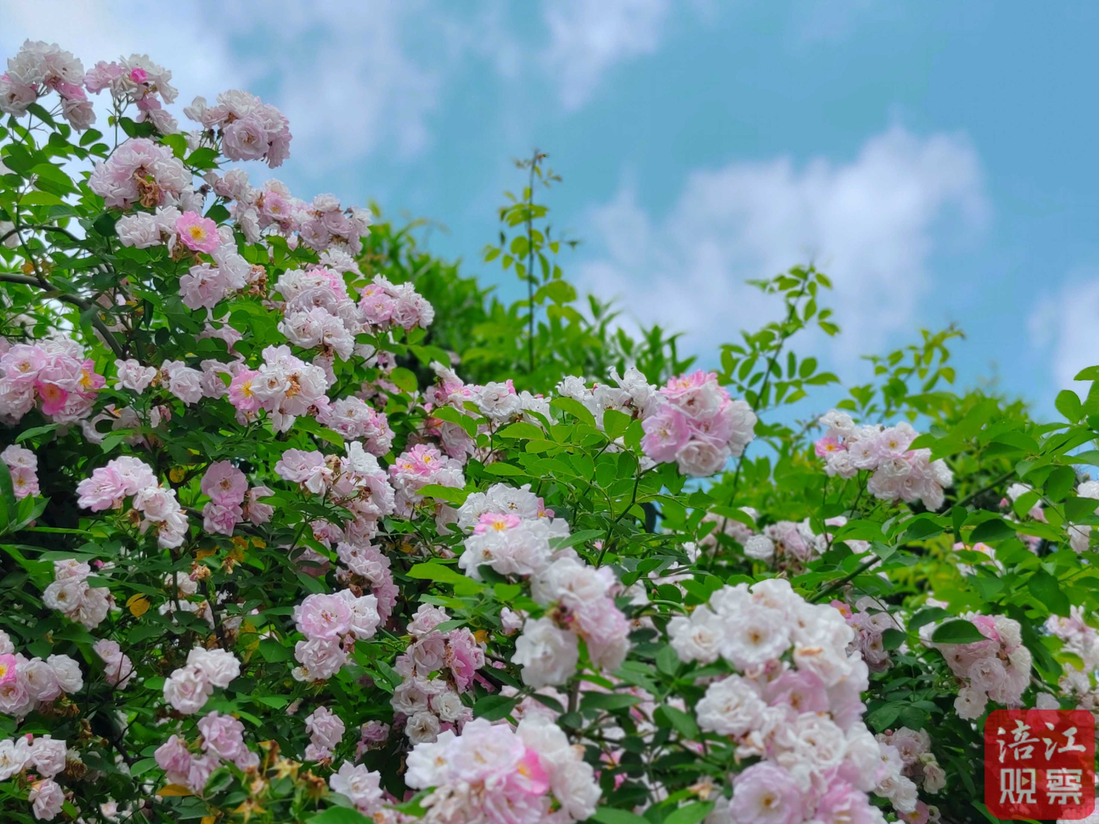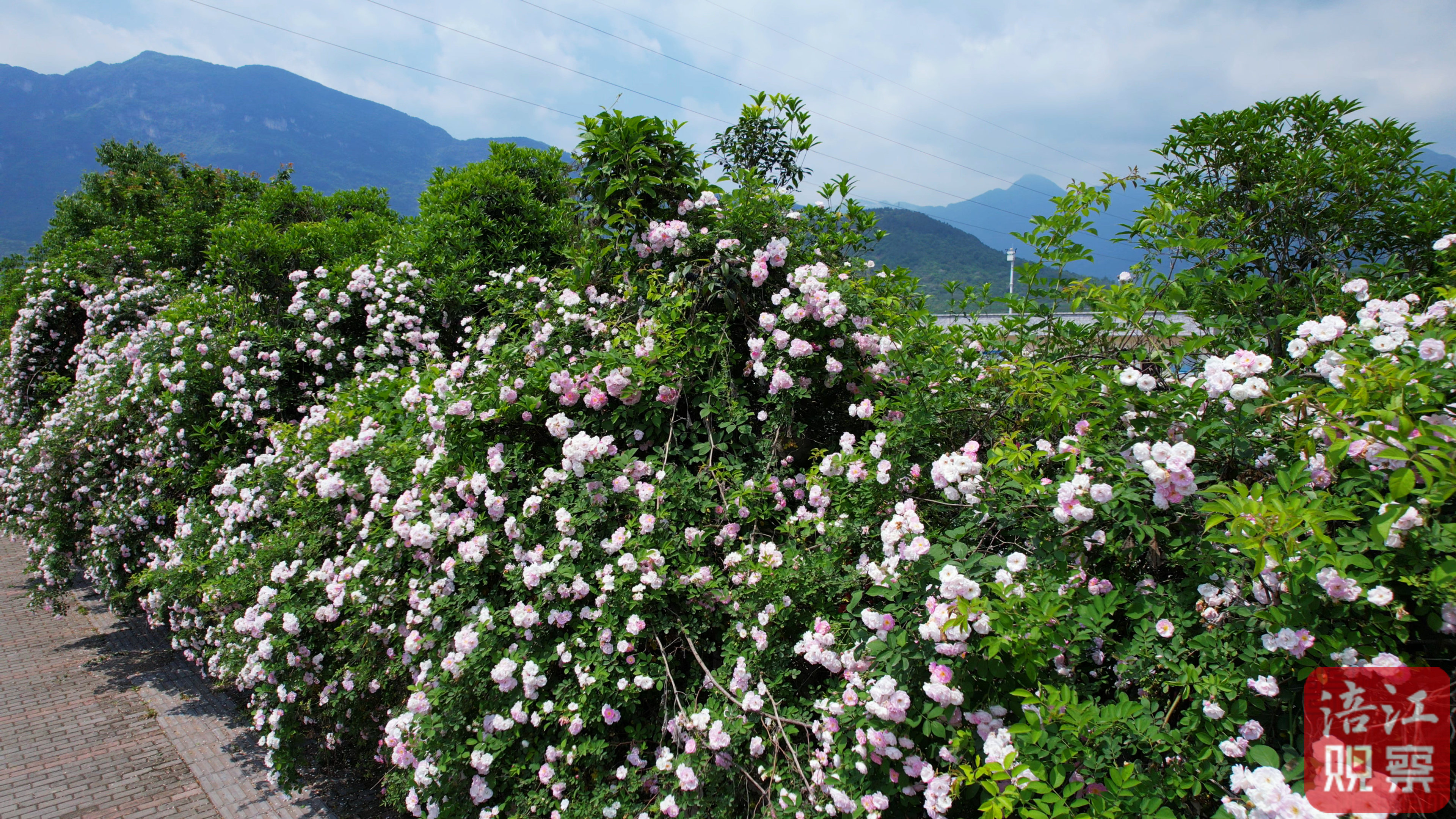 在江油市大康鎮(zhèn),主干道兩旁的薔薇藤蔓相互牽連,綴滿了雪白、粉紅的花朵,形成長(zhǎng)達(dá)數(shù)百米的繽紛“花廊”,引得游客紛紛駐足欣賞、打卡拍照。
