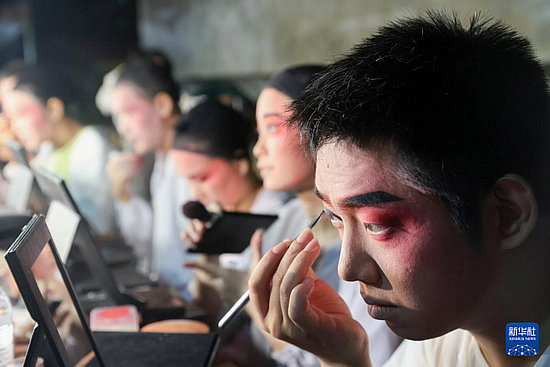 5月2日,在海南省海口市嶺梅村,陳科翰(右一)在演出前化妝。