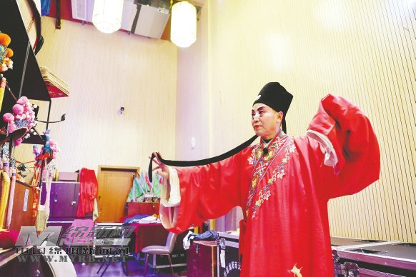 任鳳瓊在后臺身穿紅色戲服,在臉上抹完油彩化完妝,又忙著捆頭了。第二場折子戲《北樓戲嬌》她主唱旦角。“閉著眼睛演,也能倒背如流!”談起唱戲,任鳳瓊的眉眼帶笑,難掩自得。