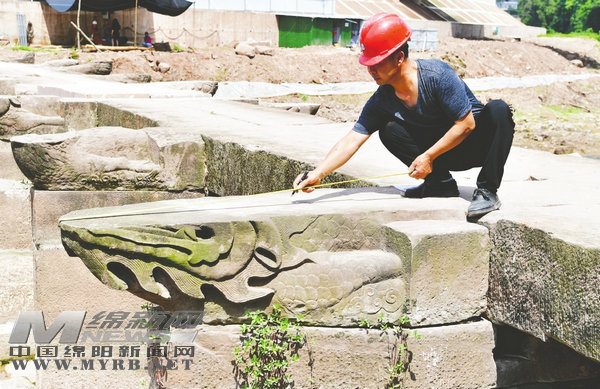 “在龍的兩腮、后腦、后頸四個地方,都用了蝴蝶榫卯進行扣接。”陳曉順指著保存較好的第三條龍龍頭向記者介紹,和木匠榫卯工藝不同,石雕榫卯更大、更粗獷,并且修復八條龍龍頭、龍尾和雕刻所用的石材,都是從郪江河床里打撈的石頭,這些從橋面掉落的板石,歷經(jīng)河水的沖刷,經(jīng)過雕刻技藝的古法處理,以修舊如舊的方式再現(xiàn)龍頭龍尾原生態(tài)的輪廓,將還原其歷經(jīng)風雨滄桑的形態(tài)和神韻。