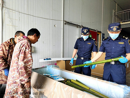 海關(guān)人員正在檢驗(yàn)巴山木竹