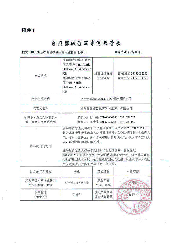 據(jù)國家藥監(jiān)局官網(wǎng)5月20日消息,箭牌國際公司Arrow International LLC主動(dòng)召回主動(dòng)脈內(nèi)球囊反搏導(dǎo)管、主動(dòng)脈內(nèi)球囊反搏導(dǎo)管及附件。(商品名:主動(dòng)脈內(nèi)球囊反搏導(dǎo)管及附件Intra-AorticBalloon(IAB)CatheterKit;主動(dòng)脈內(nèi)球囊反搏導(dǎo)管Intra-AorticBalloon(IAB) CatheterKit)。