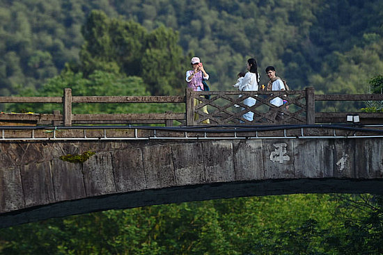 5月2日,游客在富春山鎮(zhèn)茆坪村的一座橋上賞景。富春江的一條支流蘆茨溪穿村而過。新華社記者 黃宗治 攝