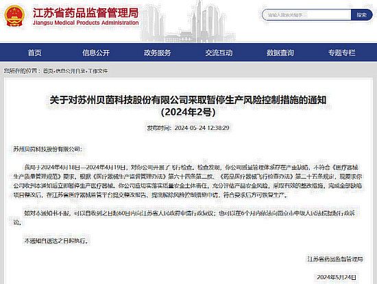 通知指出,上述兩家公司在收到通知后應立即暫停生產(chǎn)醫(yī)療器械,并切實落實質(zhì)量安全主體責任,充分評估產(chǎn)品安全風險,采取有效的整改措施,完成全部缺陷項目整改后,在江蘇省醫(yī)療器械監(jiān)管平臺提交整改報告、提出解除風險控制措施申請,符合要求后方可恢復生產(chǎn)。