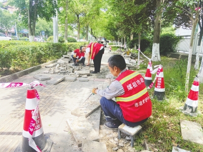 作為城市“動脈”,道路狀況關系著市民的出行安全,也是展示城市形象的重要窗口。“梓南路人行道地磚3處破損、2處松動,請馬上過來修補。”5月28日一大早,市政管護組負責人劉忠平在接到問題反映后,立馬聯(lián)系維護人員前往進行維修。