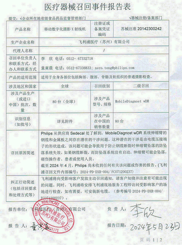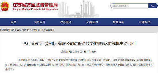 日前,江蘇省藥品監(jiān)督管理局網(wǎng)站顯示,飛利浦醫(yī)療(蘇州)有限公司(以下簡稱“飛利浦醫(yī)療”)報告稱,由于伸縮臂的鋼纜和金屬板之間存在潛在的干涉問題,可能會造成鋼纜斷裂,造成伸縮臂墜落,現(xiàn)對生產(chǎn)的移動數(shù)字化攝影X射線機(jī)主動召回。