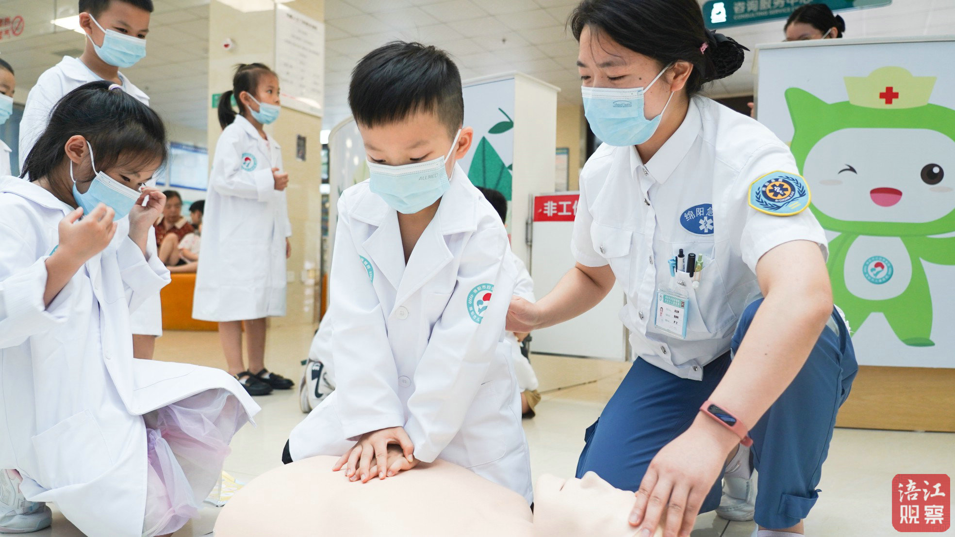 體驗(yàn)為同伴檢查視力,透過顯微鏡了解微觀世界,親手操作部分簡單醫(yī)療器械,在模擬場景下體驗(yàn)心肺復(fù)蘇術(shù)(CPR)和海姆立克法等常見緊急救護(hù)措施……一場活動(dòng)下來,“小醫(yī)生”們在互動(dòng)和體驗(yàn)中感受到了醫(yī)生的日常工作,學(xué)習(xí)到了基礎(chǔ)健康知識(shí)。他們紛紛表示,“以后長大了我也要當(dāng)醫(yī)生”“我也想治病救人”。