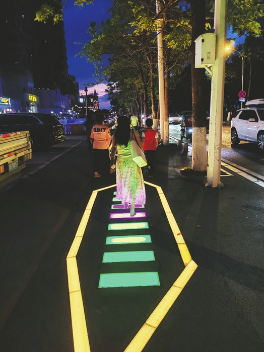 “透水混凝土具有良好滲水性能,能夠?qū)⒂晁杆贊B透到地下,減少雨水集中排放,降低洪澇風(fēng)險(xiǎn)。”三臺(tái)縣住建局城建股工作人員廖平介紹,改造后的人行道路面由碎石層、透水層、平面層組成,滲水性強(qiáng),能有效減少雨水徑流。其中,“口袋公園”附近人行道還能將雨水進(jìn)行收集儲(chǔ)存,達(dá)到二次利用的效果。同時(shí),材料充分考慮防滑,并根據(jù)不同街區(qū)選取天藍(lán)、淺灰、深灰等色彩裝飾,配合建筑和路旁花草樹(shù)木,并在沿河一線道路鋪設(shè)彩燈,深受市民喜愛(ài)。