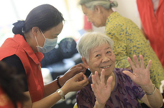黃雪芳作為志愿者關(guān)愛銀發(fā)長者健康,參加耳穴義診活動