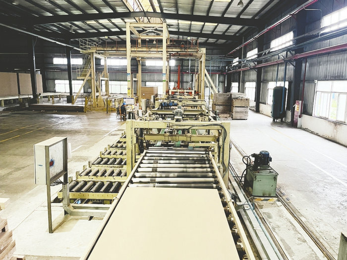 24小時不停歇的機器高速運轉,周圍彌漫著木材的氣息……走進四川建豐林業(yè)有限公司生產(chǎn)車間,四川首條進口連續(xù)平壓刨花板生產(chǎn)線上,一臺裝板機正在進行板材裝運,當板材堆積至10張,便一次性抓取到運板車上,再運送至中間倉儲系統(tǒng)存放48小時左右,然后進行拋光等后續(xù)操作。