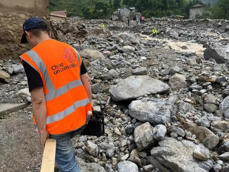 面對道路中斷、車輛無法通行的情況,應(yīng)急搶險人員通過“手提、肩扛、人抬”的方式攜帶光纜、基站、發(fā)電機(jī)等設(shè)備,踏著遍地落石與泥沙徒步深入災(zāi)區(qū)開展保障。21日10時許,中國聯(lián)通伴隨搶險隊伍在新華村五組開通便攜式衛(wèi)星設(shè)備;11時30分許,在新合村開通便攜式衛(wèi)星設(shè)備。