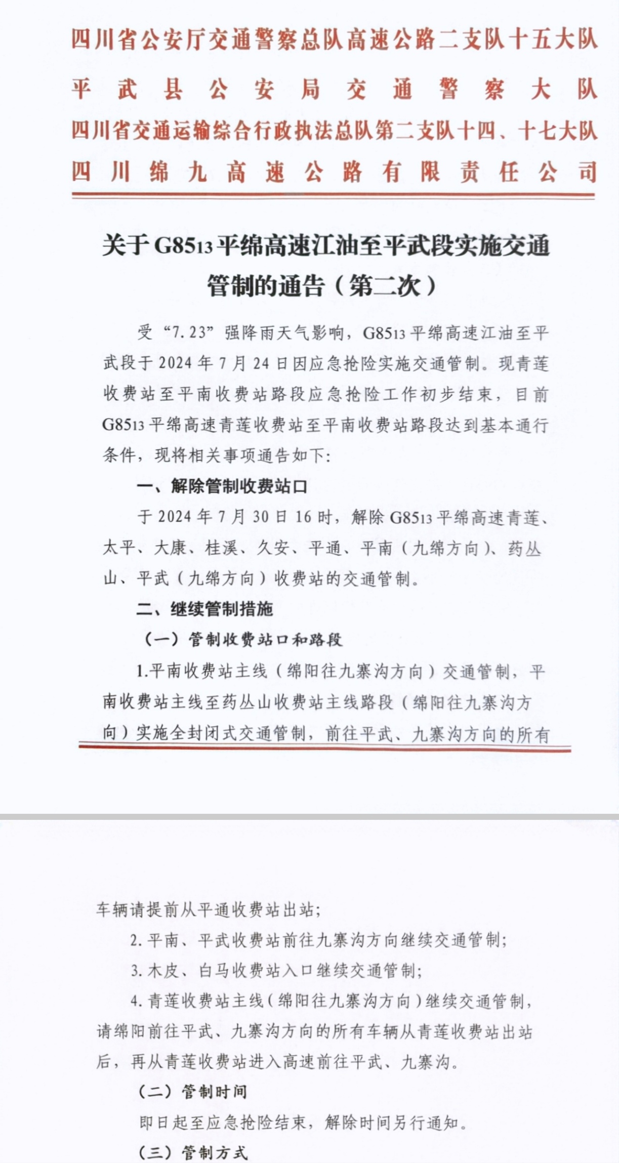 1.平南收費(fèi)站主線(綿陽往九寨溝方向)交通管制,平南收費(fèi)站主線至藥叢山收費(fèi)站主線路段(綿陽往九寨溝方向)實(shí)施全封閉式交通管制,前往平武、九寨溝方向的所有車輛請?zhí)崆皬钠酵ㄊ召M(fèi)站出站;