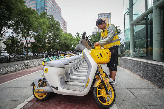2023年7月11日,遼寧共享電單車運(yùn)維員張春楠在檢查共享電單車是否存在故障。新華社記者 潘昱龍 攝