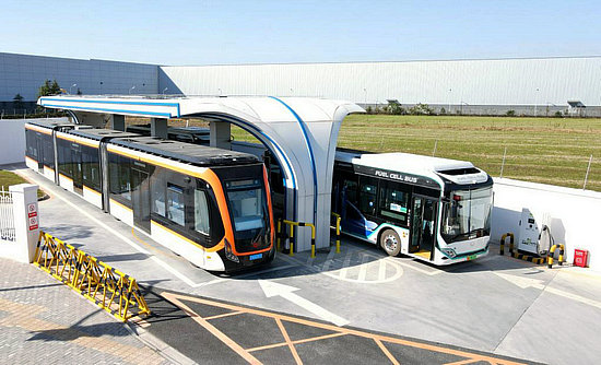 一輛氫能中運(yùn)量公交車(左)駛?cè)肱R港新城氫能公交車加氣站(無人機(jī)照片)。(資料照片)新華社記者 方喆 攝