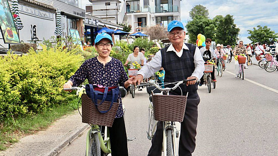 7月5日,一對已經(jīng)退休的越南夫妻在大理洱海邊騎行。 新華社記者 王賢思 攝