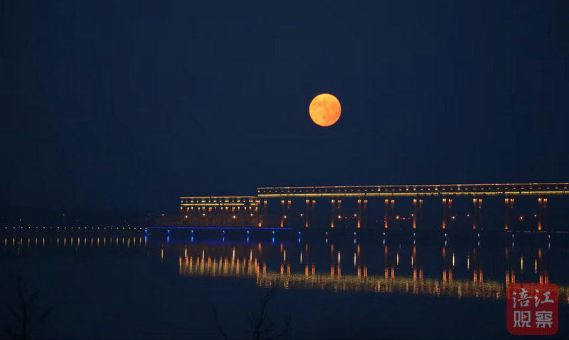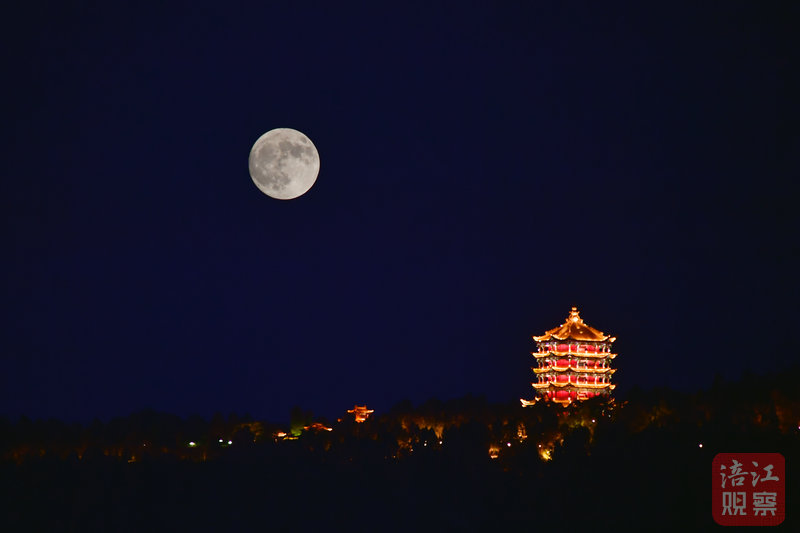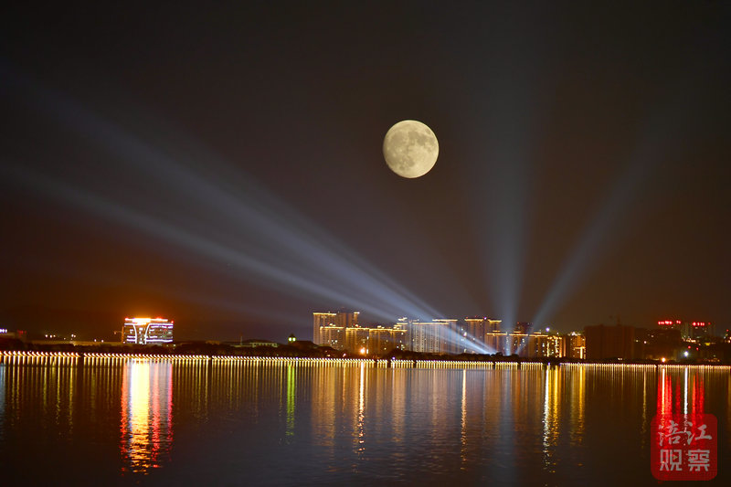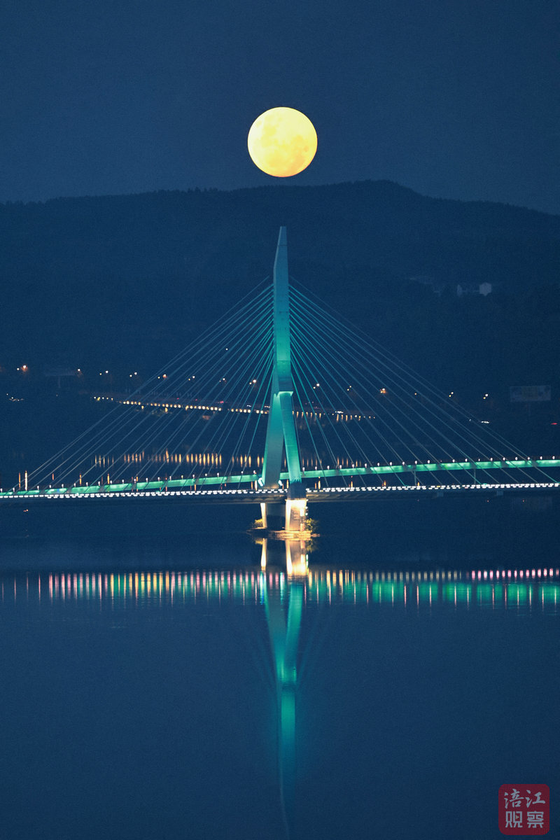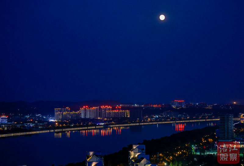 ↑9月17日晚,城區(qū)三江大壩上空的滿月。視覺綿陽 謝江平/攝