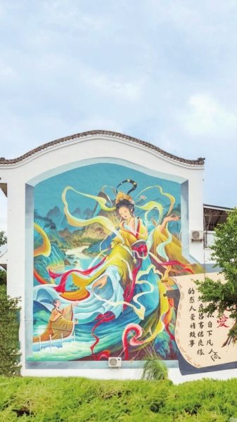 沿著沉山路繼續(xù)往前走,白墻青瓦的民居建筑側(cè)面與后墻,繪制著一幅幅栩栩如生的彩繪,有形神俱備的神話故事,有深邃澄碧的天空,有嬌艷妖嬈的桃花……生動(dòng)逼真的人物神態(tài)、鮮艷熱烈的“多巴胺”色彩,巧妙地將建筑外立面窗戶、空調(diào)外機(jī)、屋頂?shù)热谌氘嬛校磺酗@得自然流暢。