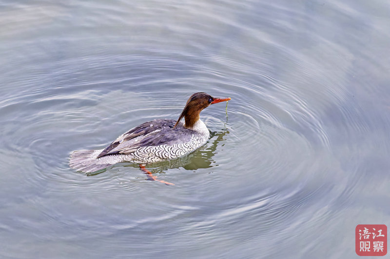 記者跟隨觀鳥愛好者們來到了涪江水域,在一處水質(zhì)清澈、水草豐茂的河段,觀鳥愛好者尚召楊發(fā)現(xiàn)了一只外形獨特、羽色艷麗的鳥類正在覓食、嬉戲。通過高倍單筒望遠(yuǎn)鏡觀測,該水鳥頭部有羽冠,嘴長而窄,呈桔紅色,兩脅和胸側(cè)有黑色鱗狀斑,經(jīng)鑒定為國家一級保護動物——中華秋沙鴨。