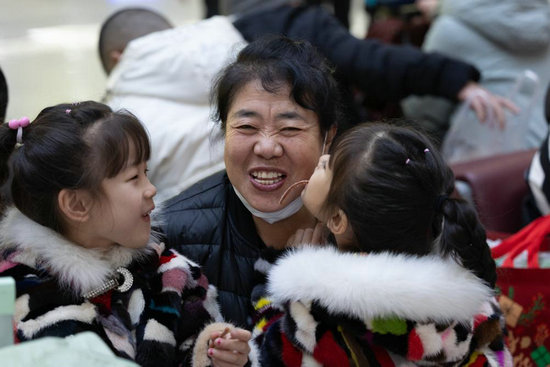 1月14日,在哈爾濱火車站候車大廳,小朋友和姥姥一起吃東西。她們從黑龍江省牡丹江市去往海南省??谑羞^(guò)年。新華社記者 張濤 攝