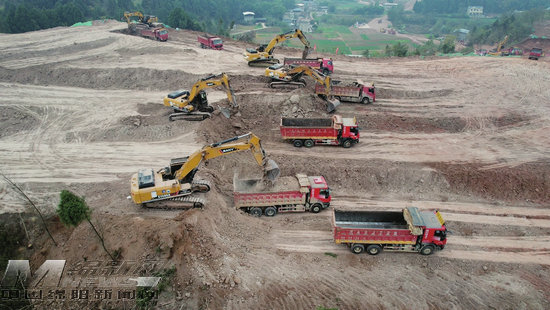 1月16日,記者在G247三臺縣永明至花園公路工程標頭段建設(shè)現(xiàn)場看到,挖掘機、裝載機、運輸車有序忙碌,巨大的轟鳴聲中,一段路基雛形漸漸呈現(xiàn)。