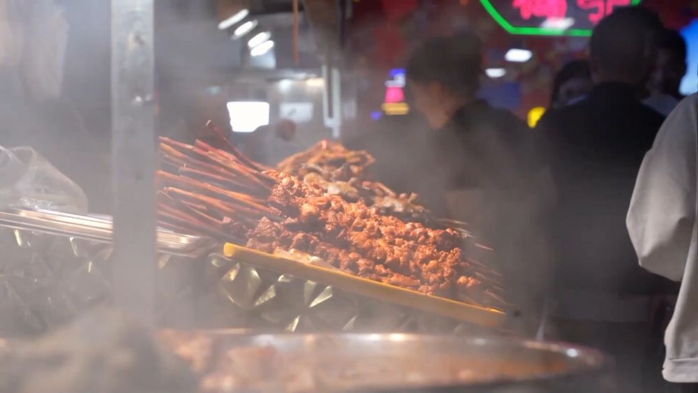 新疆和田夜市成了不少游客的“打卡地”,各種各樣的美食攤位前坐滿了食客。
