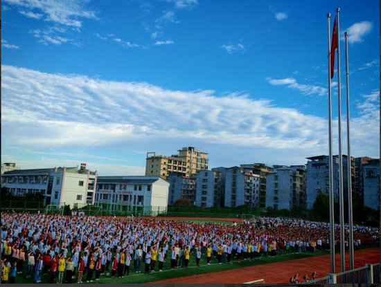 全體師生齊聚操場,舉行了主題升旗儀式,五星紅旗冉冉升起,莊嚴(yán)的國歌聲響徹校園。