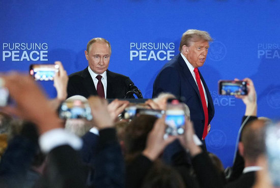 8月15日,美國(guó)總統(tǒng)特朗普(后右)與俄羅斯總統(tǒng)普京(后左)在美國(guó)阿拉斯加州安克雷奇市埃爾門多夫-理查森聯(lián)合軍事基地舉行會(huì)晤后共同出席聯(lián)合記者會(huì)。新華社記者吳曉凌攝