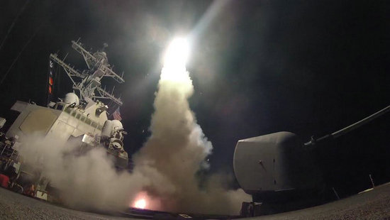 2017年4月7日,美國(guó)海軍艦船在地中海發(fā)射一枚“戰(zhàn)斧”導(dǎo)彈。新華社發(fā)(美國(guó)海軍供圖)