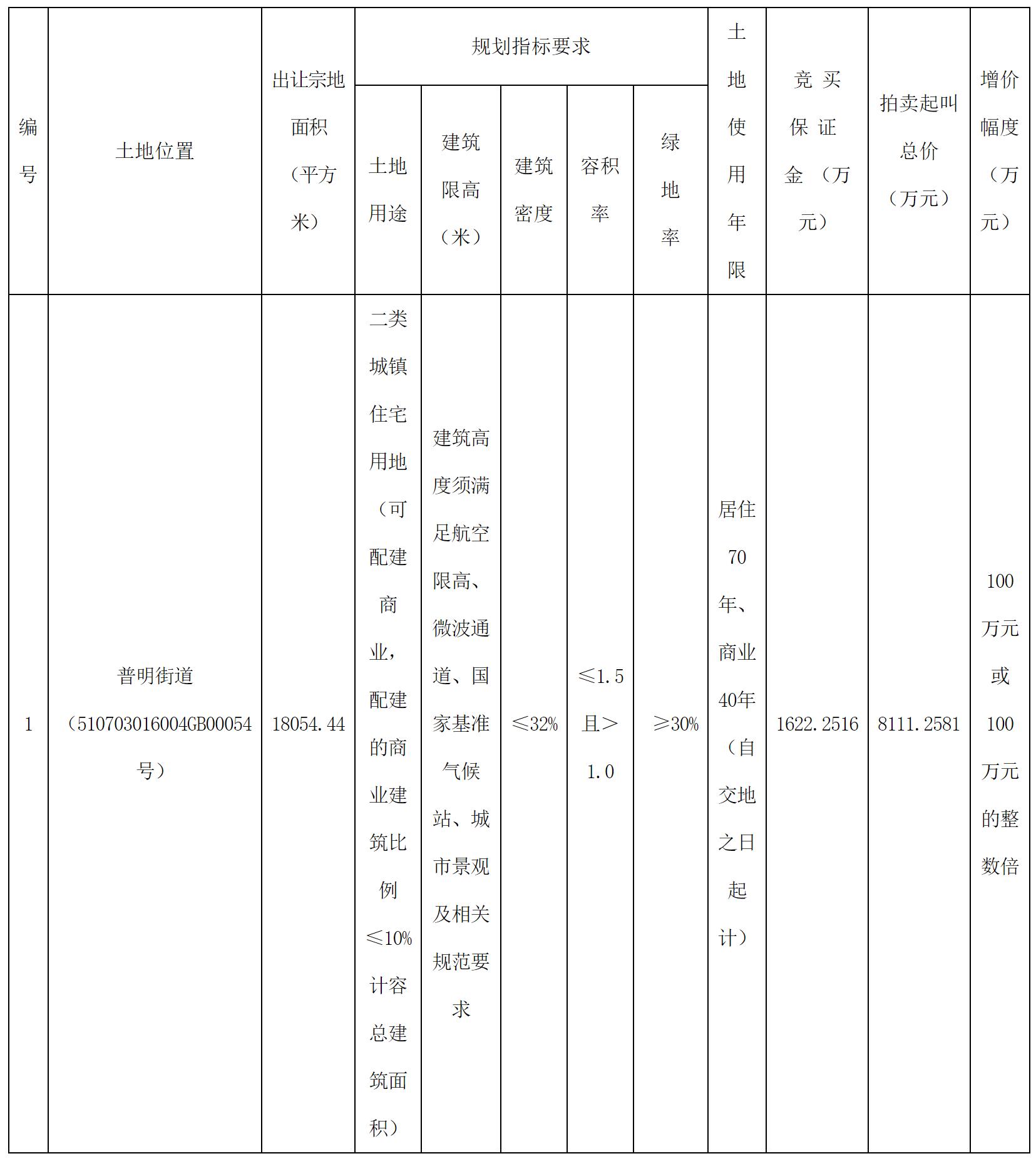 經(jīng)綿陽(yáng)市人民政府批準(zhǔn),綿陽(yáng)科技城新區(qū)管理委員會(huì)決定以拍賣方式出讓一宗國(guó)有建設(shè)用地使用權(quán),綿陽(yáng)市公共資源交易服務(wù)中心具體組織實(shí)施本次拍賣出讓活動(dòng),現(xiàn)將有關(guān)事項(xiàng)公告如下: