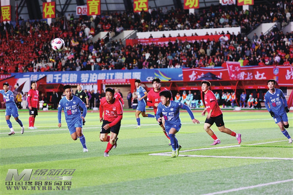 穿紅色球衣的綿陽(yáng)隊(duì)球員在比賽中展開密集攻防