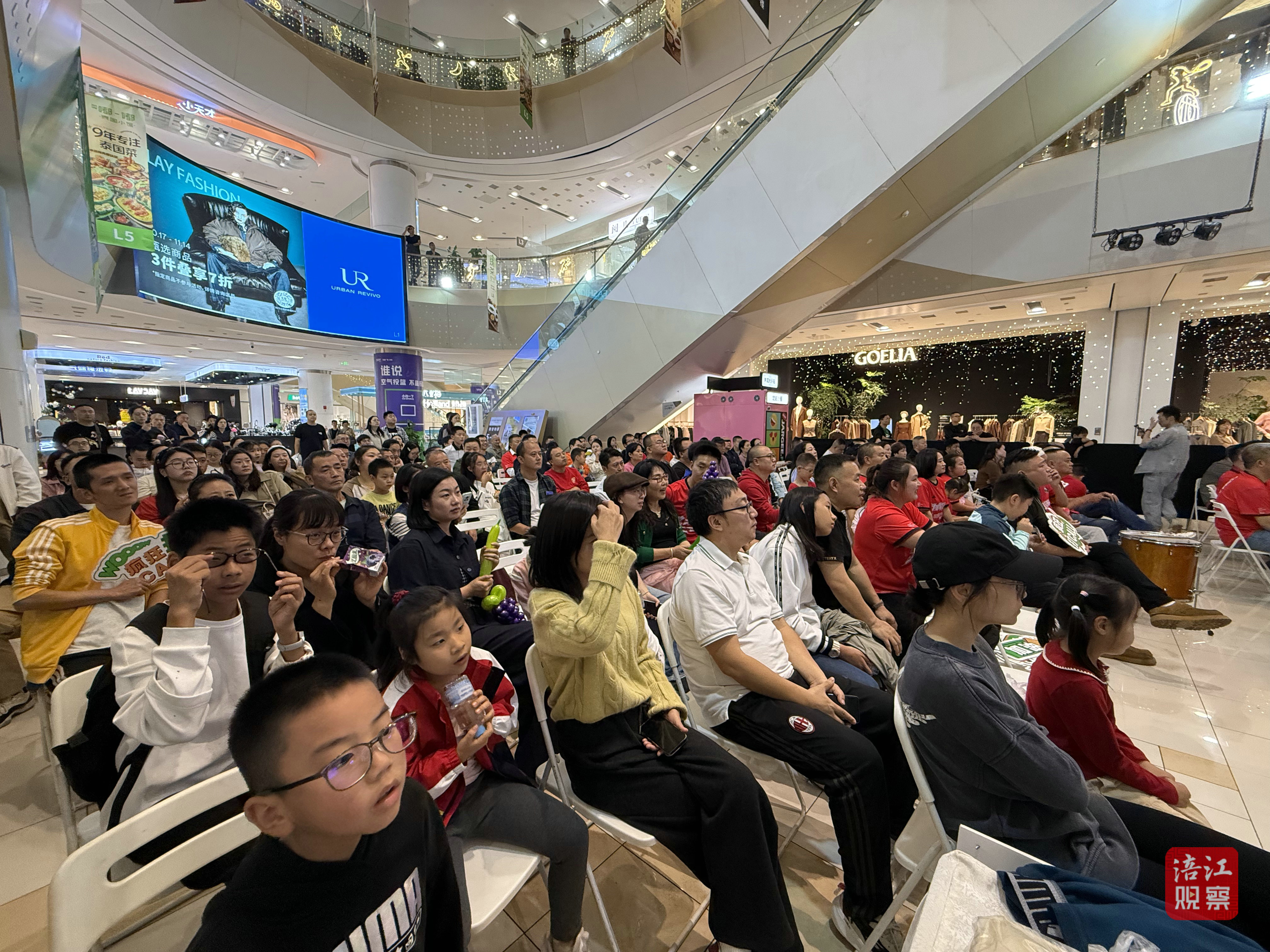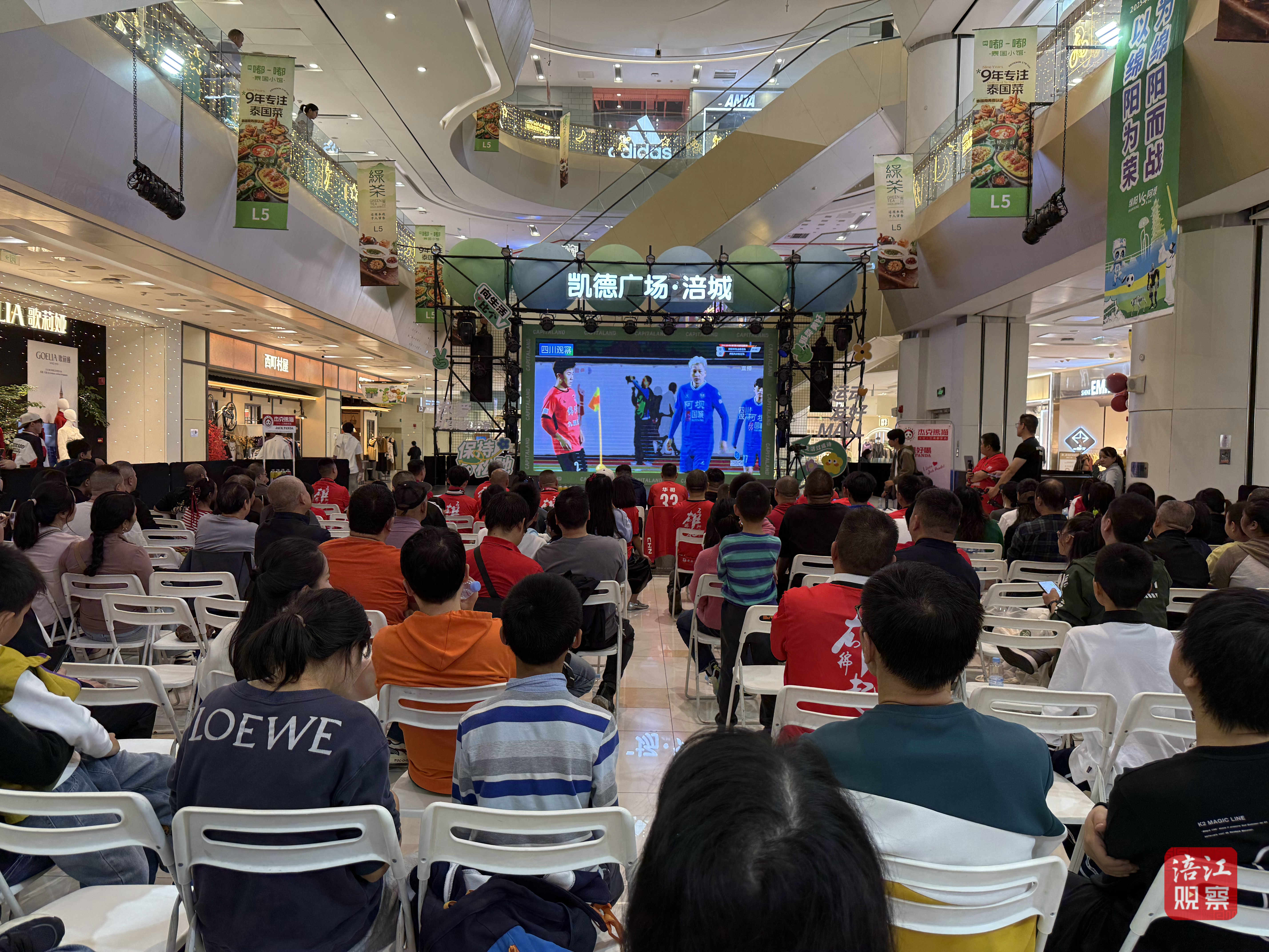 傍晚時分,球迷早早來到圣名國際購物廣場第二觀賽點,手持應援牌,通過大屏幕為綿陽隊加油。