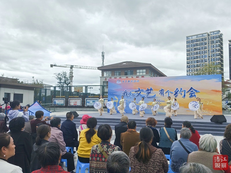 15時,在歡快的旋律中,舞蹈《起舞》為當(dāng)天的惠民演出啟幕。在音舞相伴的氛圍中,不斷有居民被吸引過來。舞臺風(fēng)格切換,合唱《萬疆》登臺,聽到熟悉的旋律,不少觀眾和著節(jié)拍輕輕哼唱。