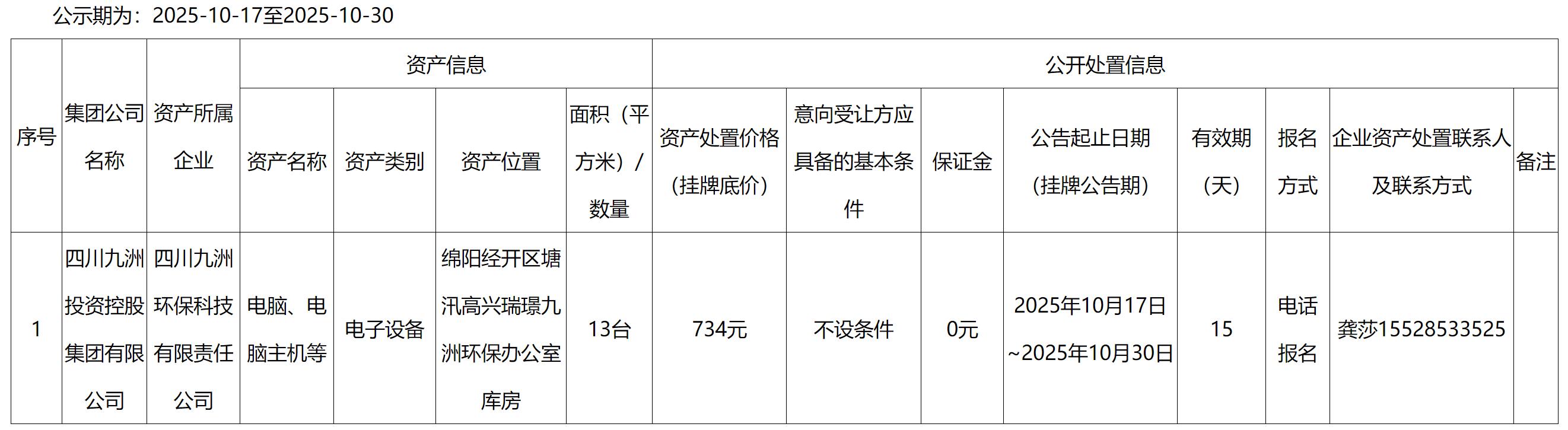 四川九洲環(huán)??萍加邢挢?zé)任公司電腦、電腦主機(jī)等電子設(shè)備資產(chǎn)處置公告