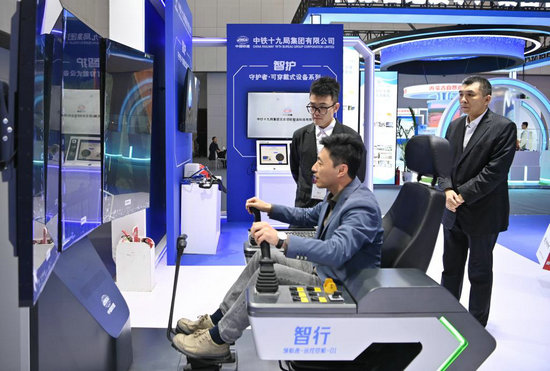 10月23日,參會者在礦山機(jī)械裝備博覽會上體驗遠(yuǎn)控挖機(jī)。新華社記者 李然 攝
