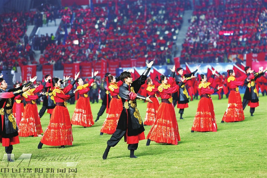 從開場表演《郪風(fēng)唐韻》,“鳳凰于飛”燈光秀光影流轉(zhuǎn),鳳翼翩然,到充滿青春氣息的團(tuán)體操,兩地文化符號(hào)輪番上演,將古風(fēng)古韻與團(tuán)結(jié)熱烈的氛圍拉滿。