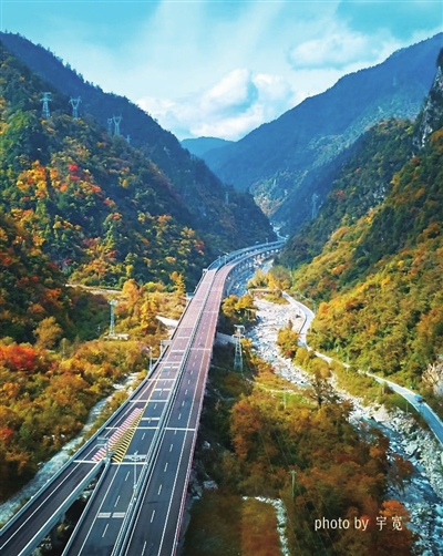 隨著彩林季到來,九綿高速也變身“彩林觀光大道”。其中,從平武縣城到王朗收費站的70余公里路段,堪稱整條高速的“顏值天花板”——公路蜿蜒穿梭在漫山彩林間,每一個轉(zhuǎn)彎都帶來視覺沖擊。駕車行駛在此,窗外是打翻調(diào)色盤般的群山,仿佛遨游在五彩斑斕的畫廊中,讓人心曠神怡。