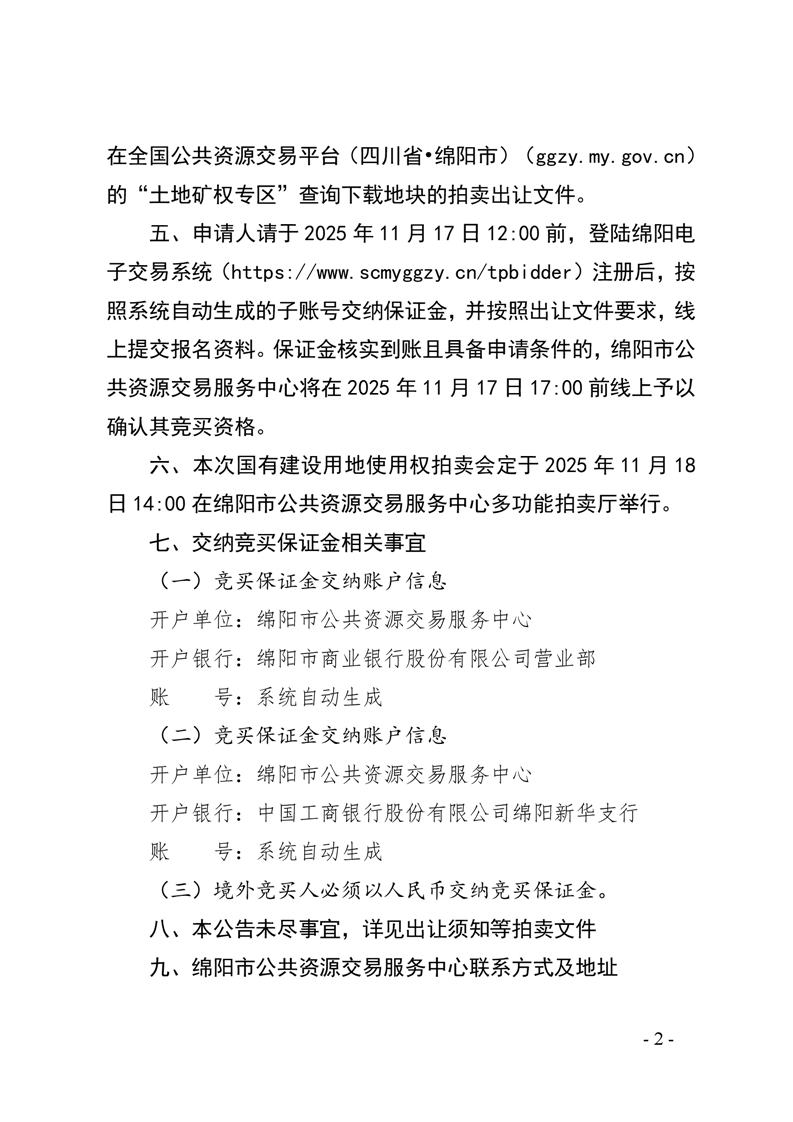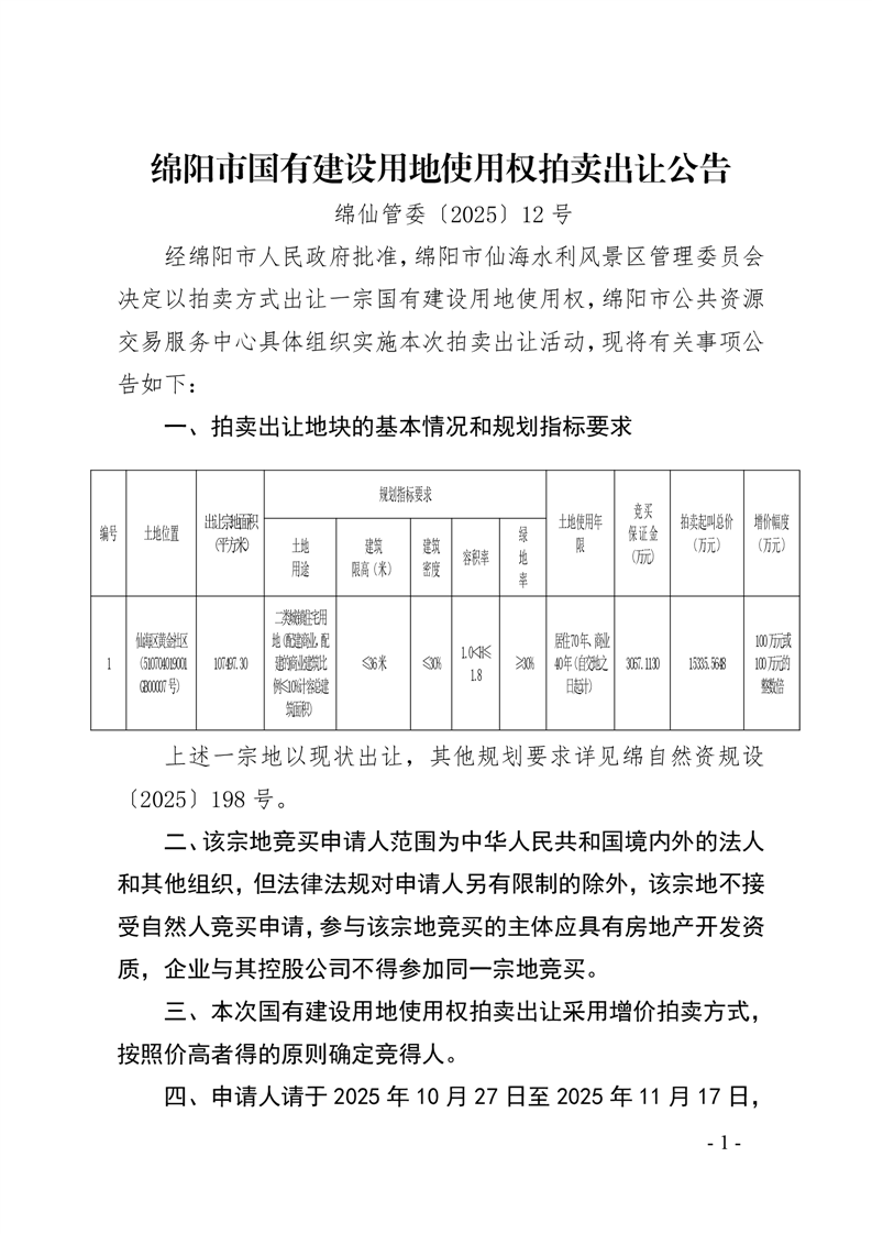 綿陽市國有建設(shè)用地使用權(quán)拍賣出讓公告(綿仙管委〔2025〕12號)