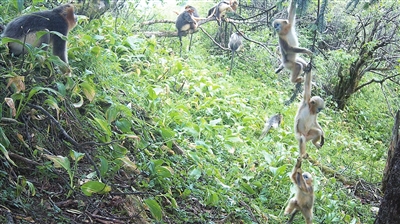 不遠(yuǎn)處,川金絲猴的日常生活同樣充滿樂趣。視頻畫面中,猴王端坐在鏡頭前,神態(tài)嚴(yán)肅,體現(xiàn)著獨(dú)一無二的種群地位;母猴為同伴細(xì)心理毛,進(jìn)行維系群體關(guān)系的“社交禮儀”;川金絲猴幼崽們非?;顫?,連成一串掛在樹枝上嬉戲,反映出種群繁衍的活力以及對棲息地環(huán)境的高度信任。