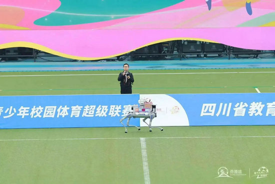 開幕式結(jié)束后,機器狗送上比賽用球,成都蓉城俱樂部中超主力中后衛(wèi)楊帥為比賽開球,揭幕戰(zhàn)正式打響,由四川天府新區(qū)籍田小學(xué)對陣資中縣水南鎮(zhèn)中心學(xué)校,兩支平均年齡不滿11歲的女子球隊展開激烈對抗,充分展現(xiàn)了拼搏精神與校園體育的蓬勃生命力。