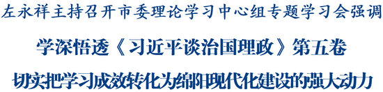 綿陽新聞網(wǎng)訊 11月3日,市委理論學(xué)習(xí)中心組舉行專題學(xué)習(xí)會,集中學(xué)習(xí)《習(xí)近平談治國理政》第五卷。省委常委、市委書記左永祥主持會議并談?wù)J識體會。他強(qiáng)調(diào),要學(xué)深悟透《習(xí)近平談治國理政》第五卷,更加深刻領(lǐng)悟習(xí)近平新時代中國特色社會主義思想的真理力量和實(shí)踐偉力,自覺從中悟規(guī)律、明方向、學(xué)方法、增智慧,切實(shí)把學(xué)習(xí)成效轉(zhuǎn)化為綿陽現(xiàn)代化建設(shè)的強(qiáng)大動力。