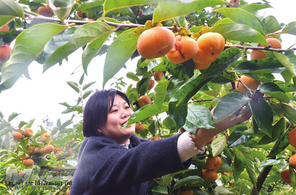 山路旁、山坡上、山坳里……到處都是柿子樹(shù),一顆顆碩大的柿子火紅火紅的,儼然一盞盞精巧的小燈籠。三五成群的游客在柿子園里穿梭,劉先生和趙女士來(lái)自成都,他們是從網(wǎng)上得知這里能實(shí)現(xiàn)“柿子自由”,就趁周末結(jié)伴過(guò)來(lái)采摘、品嘗。