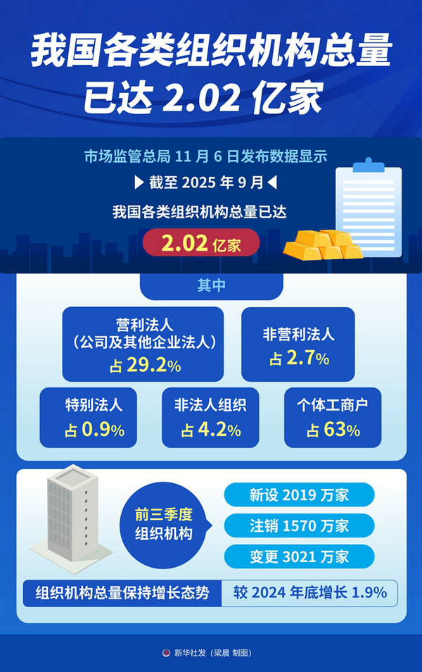 新華社北京11月6日電(記者趙文君)市場監(jiān)管總局6日發(fā)布數(shù)據(jù)顯示,截至2025年9月,我國各類組織機構(gòu)總量已達(dá)2.02億家。其中,營利法人(公司及其他企業(yè)法人)占29.2%;非營利法人占2.7%;特別法人占0.9%;非法人組織占4.2%;個體工商戶占63%。